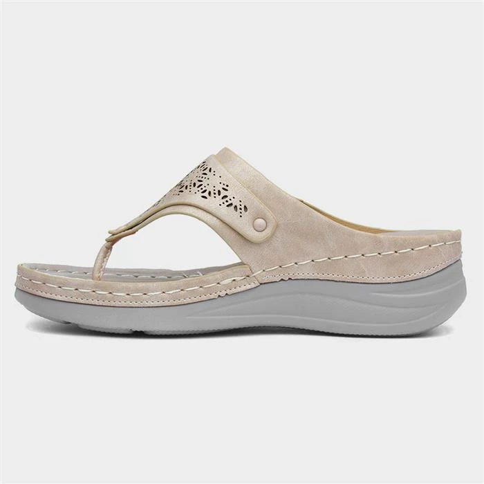 By Comfy Step, these womens mule toe post sandals embrace a beige upper with cut out detailing, they feature slip on fitting with a low wedge sole and padded insole offering all day comfort.