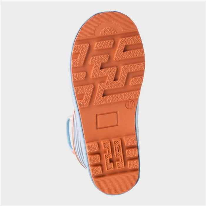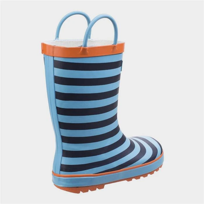 By Cotswold, kids welly in blue. These children’s wellington boots from Cotswold are simple to pull on with their user friendly carry handles! A retro stripy design using bright colours, ideal to take with you for when the weather changes.