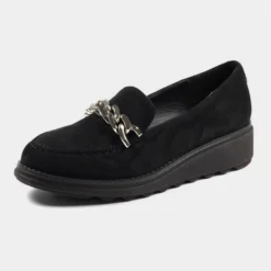 By Cushion Walk, these Emily shoes feature a black upper with laser-cut and stitch detailing. They’re easy to slip on, and their elasticated buttoned strap allows a customised fit. For comfort, they feature a cushioned insole; for height, a wedged heel and for stability, a gripped outsole