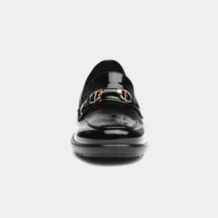 By Cushion Walk, these women’s loafer shoes embrace a black patent upper with a gold bar trim. They feature an easy slip on fitting, while their padded insole and flexible wedge outsole provides comfort and support.