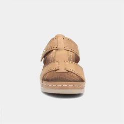 From Cushion Walk, these women’s mule sandals embrace a tan upper with cut out and stitch detailing. They feature a slip on design with a touch fasten strap for an adjustable fit, while their padded insole and wedge outsole provides comfort beneath your feet.