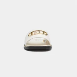 These Odetta women’s sliders from Elle feature a cream upper with a gold Elle plate on the toe, and chain detailing around the outsole. Their outsole has a low heel and is gripped for stability.