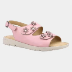 By Fleet & Foster, Kara womens sandals in pink. An open toe touch fastening leather sandal featuring a memory foam footbed with cushioning and a slight heel
