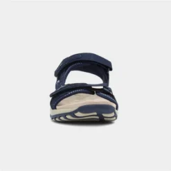 From Free Spirit, the Frisco women’s sandal in navy. It features contrasting blue stitching, Aztec style detailing, double easy fastening straps for a secure fit, and a breathable lining. Their multi-layer insole provides comfort, support, joint protection and an enhanced anatomic fitting, while their non-slip treaded outsole offers maximum flexibility, and ensures stability too.
