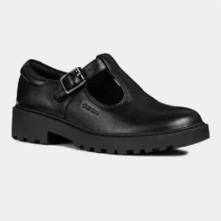 By Geox, these J Casey girls black leather shoes feature a T-Bar upper with a buckle strap fitting for a secure fit. They have a gripped chunky outsole which provides greater stability, and their breathable membrane helps to keep feet comfortable by regulating their temperature.