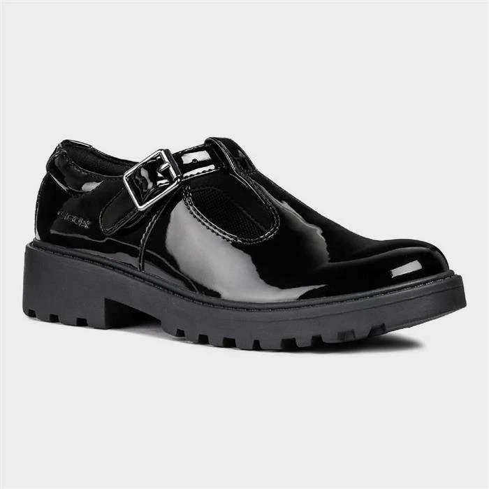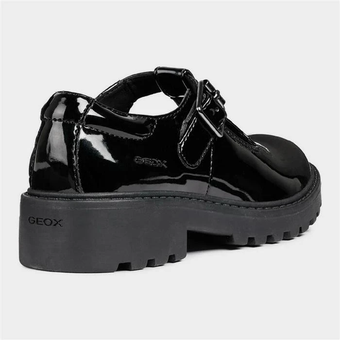 By Geox, these J Casey G. E girls shoes feature a black patent leather upper with a T-Bar and buckle strap for a secure fit. They feature a low heel and a cleated outsole which offers additional height, and greater stability. A breathable membrane helps to keep feet comfortable by regulating the temperature inside the shoe.