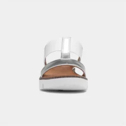 From Heavenly Feet, the Ritz women’s sandal. in white and silver. They feature a T-Bar upper with an elasticated strap for an easy slip on. Their SoftFlex comfort foam insole ensures maximum cushioning and comfort, while their chunky, cleated outsole ensures stability. These sandals are also made using animal friendly materials.