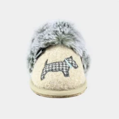 By Lazy Dogz, these Scottie womens slippers in beige. This stunning slipper is a must for all doggy lovers, especially those with a love of Scotties. This slipper is available in beige or grey, and features a Scottie motif to the upper and is finished with a faux fur lining, trim and padded insole.