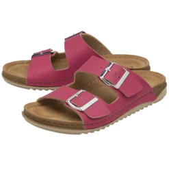 These Cortana women’s sandals in raspberry pink are perfect to go with your summer looks. These almost flat, slip-on mule encompasses two straps complete with a buckle fastening for an adjustable fit and a leather insock to provide you comfort.