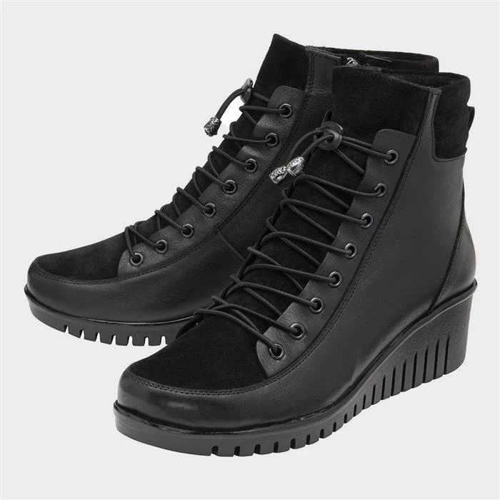 Designed by Lotus, the Delphine women’s boots in black feature lace up fastening with an adjustable toggle for a secure fit. They feature premium leather and suede on the upper that sits comfortably on a 4.5cm wedge heel that adds both height and stability. These boots will soon become your favourite go-to footwear.
