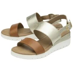 These Madelyn women’s sandals in tan by Lotus are crafted from leather and feature a metallic strap on the upper. their adjustable slingback fastening ensures a secure fit, while its contrasting white 5cm wedge heel adds height and their open toe allows your feet to breathe. These shoes are a great addition to your summer wardrobe and perfect for daytime glam.