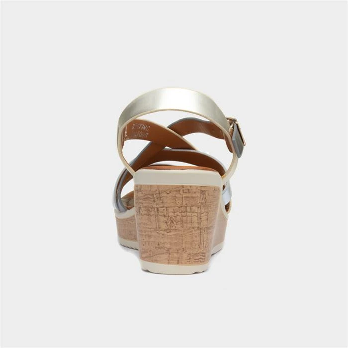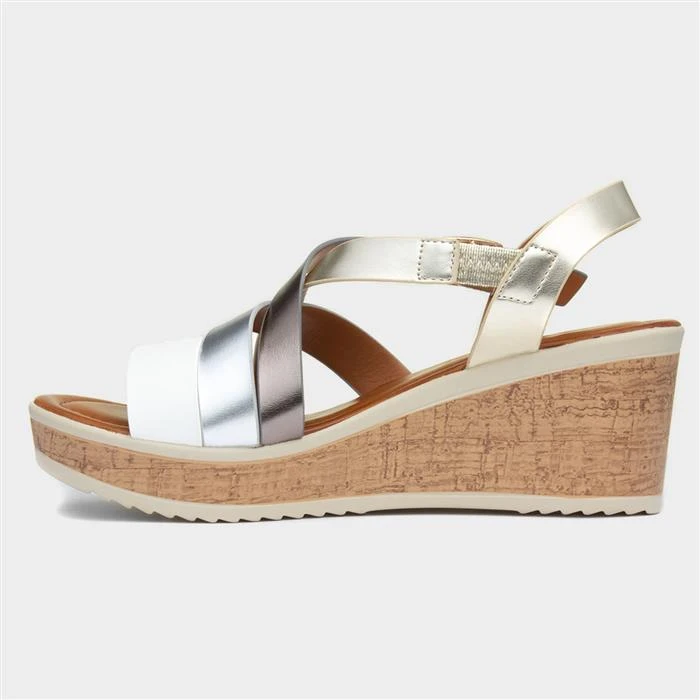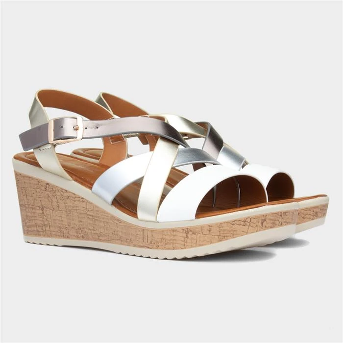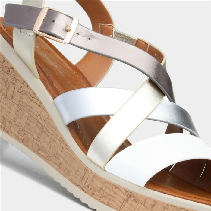 From Lunar, the Balfour women’s sandal in metallic silver, white and gold. It features a strappy upper, stretch buckle fastening for an easy fit, and padded insole for comfort. Their wood-effect wedged heel adds height, while their gripped outsole ensures stability.
