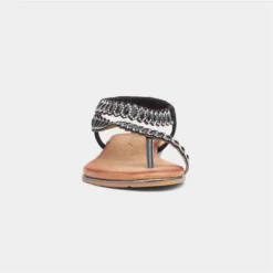 From Lunar, the Novella women’s sandal in black. It features a “glitzy” diamante upper with toe post and elasticated slingback strap for an easy slip on. Their padded insole brings comfort, while their low wedged heel brings height. Additionally, they feature a gripped outsole for stability.