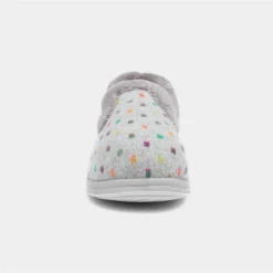 Designed by Padders, these women’s slippers embrace a light grey upper with multi coloured spots. They feature a slip on fitting with a soft collar, while their memory foam insole is anti-bacterial and anti-fungal for fresh and comfortable feet.