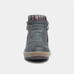 These women’s ankle boots from Relife are as cosy as they are stylish. Their unique cushioning provides relief and relaxation for your spine whilst massage elements stimulate the reflex zone in your heels. Created with warmth in mind, these boots showcase a fleece lining and insole, perfect for those frosty days! They embrace a smooth grey upper, along with fine stitch detailing and a multi-toned knitted collar for the finishing touch. Their double zip up design means they’re ideal for both quick and easy fitting.