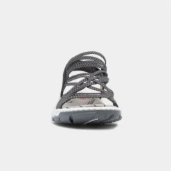 These women’s sandals from Rieker feature a black strappy upper with white stitch detailing that stretches for an easy slip on and comfortable fit. Their AntiStress insole offers comfort, support, and a lightweight feel, and their cleated outsole ensures stability and durability.
